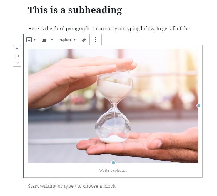 To add a subheading click on the little arrow above a paragraph to add a block and then choose ‘Heading’ from the list. It will give you an empty box in which to type your subheading. The default is an ‘H2’, which is a second level subheading and perfect for the subheadings you’ll need in your blog. You can just type the text in the box which is presented to you.